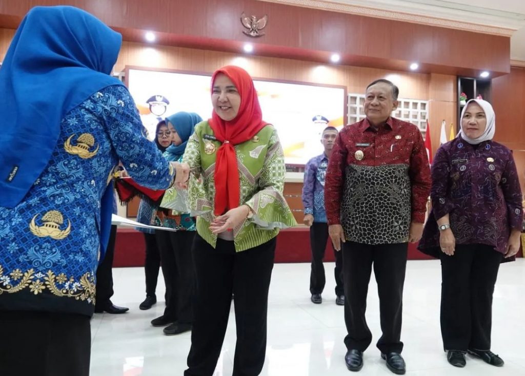 BANDAR LAMPUNG — Wali Kota Bandarlampung Eva Dwiana menyerahkan surat keputusan Wali Kota dan bantuan purnabakti sebesar Rp1 juta kepada pegawai negeri sipil (PNS) yang memasuki batas usia pensiun dan PNS yang meninggal dunia.